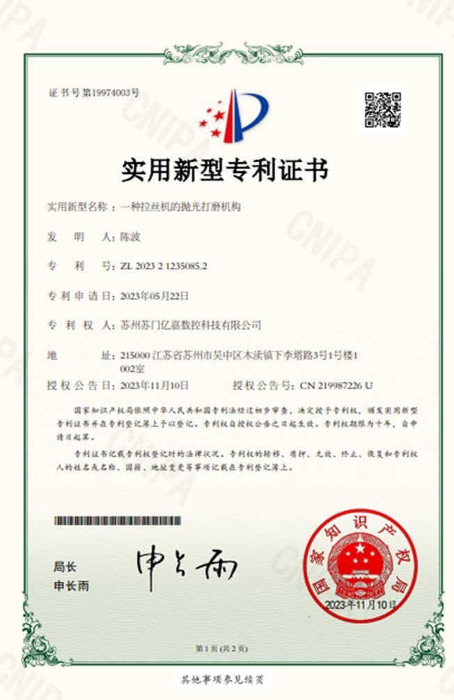 自創立以來,蘇門億嘉深耕金屬表面處理領域,憑借多年積累的行業經驗與技術沉淀,成功布局涵蓋表面處理、金屬倒角、平面拉絲機等多中金屬表面加工場景。公司擁有完全自主知識產權,技術水平位居行業前列。目前,品牌銷售網絡已覆蓋美國、歐洲、俄羅斯、越南等主要區域,憑借卓越的產品品質與服務,在全球市場樹立了良好的品牌形象與信譽。